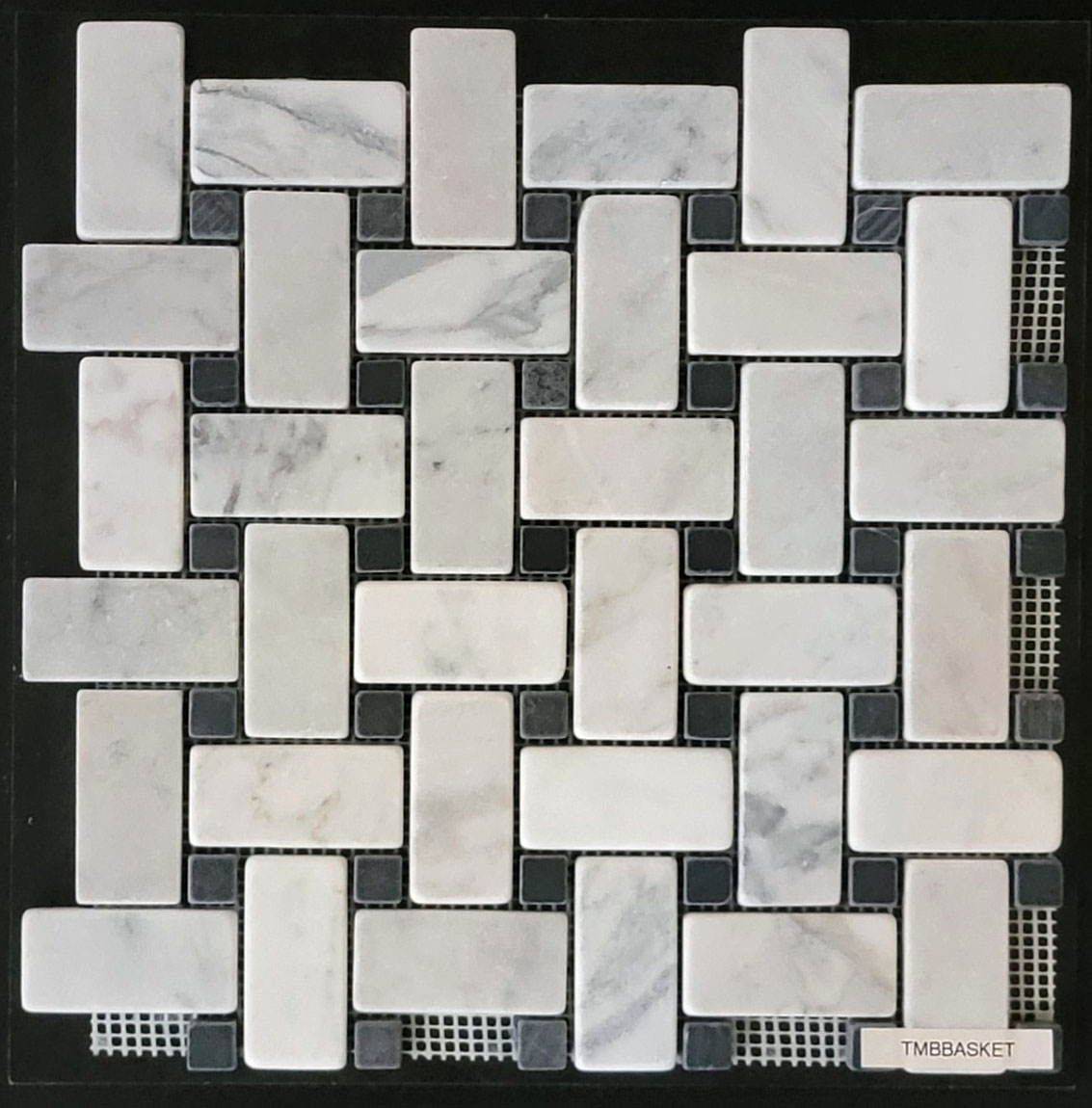 TMBBASKET - TUMBLED MIXED WHITE MARBLE WITH BLACK DOT BASKETWEAVE PATTERN MOSAIC